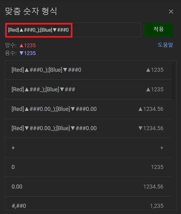 저 입력창에 [Red]▲###0_);[Blue]▼###0 를 입력해주세요.