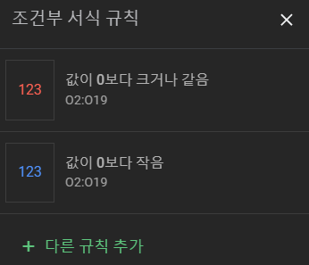 저는 이렇게 같은 셀에 두 가지 조건부 서식을 적용했습니다.