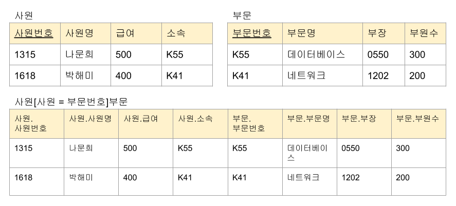 말 그대로 결합 속성관의 관계로 두 릴레이션의 튜플을 결합시키는 연산