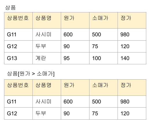 선택을 통해 추출된 릴레이션은 다음과 같이 정의된다.