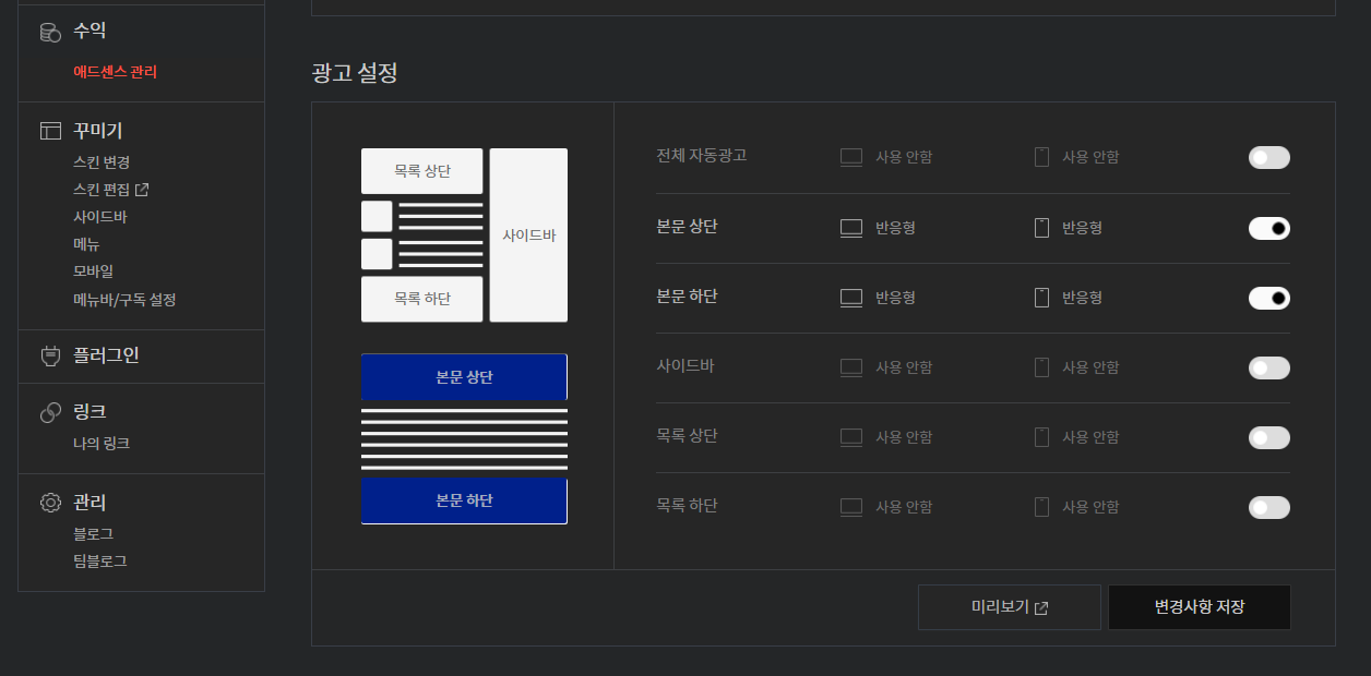 간단히 원하는 위치의 광고를 키고 끔으로서 관리 가능한 점은 편리하네요.