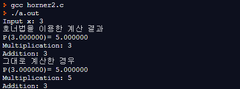 보다시피 호너법을 이용한 경우가 계산 횟수가 더 적은 걸 알 수 있다.