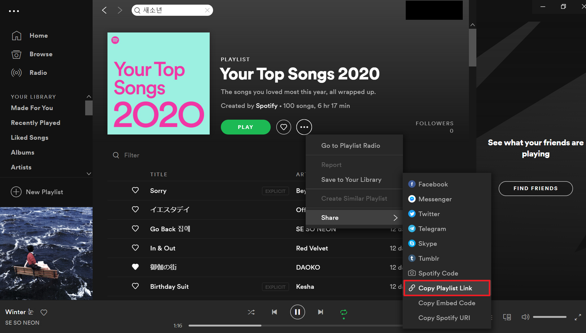 스포티파이의 경우 점 세개 버튼을 클릭하면 플레이리스트 링크를 복사할 수 있습니다.