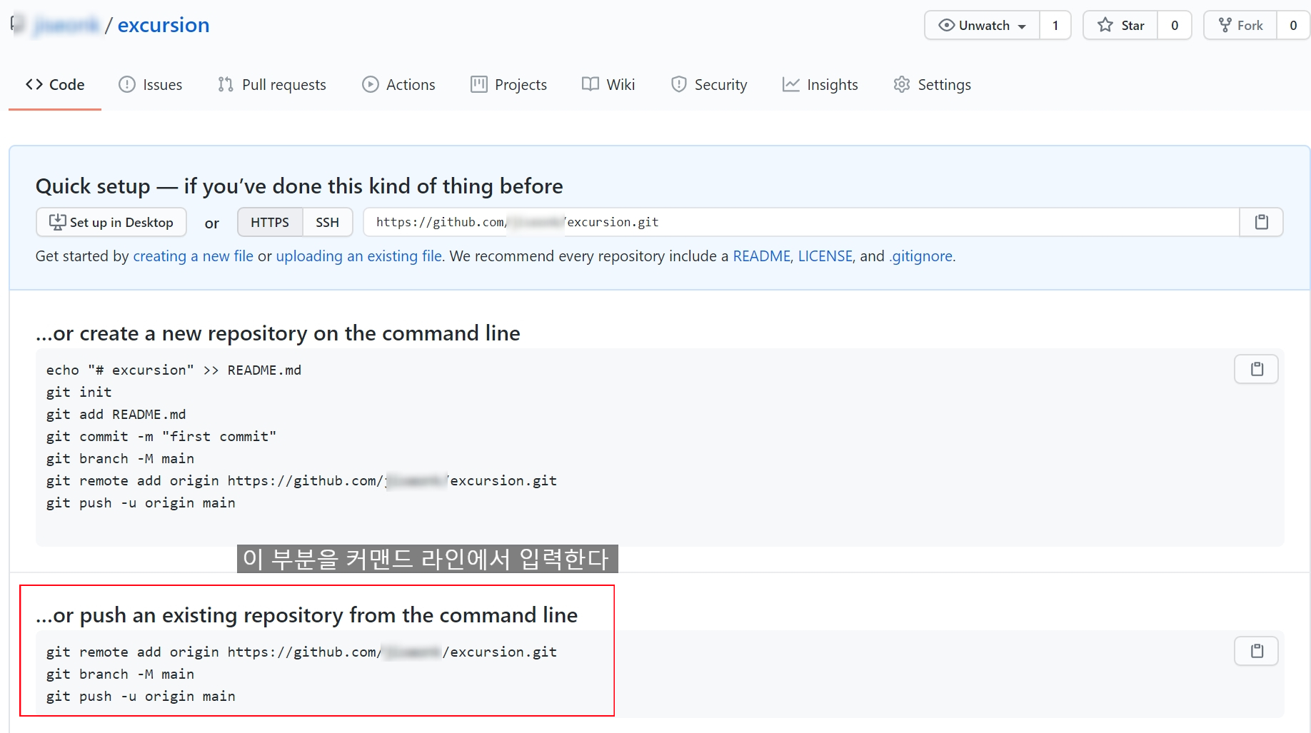 8. 새로운 저장소를 생성하면 아래와 같은 화면이 나오는데 push 어쩌구 하는 부분의 코드를 그대로 터미널에서 입력한다.