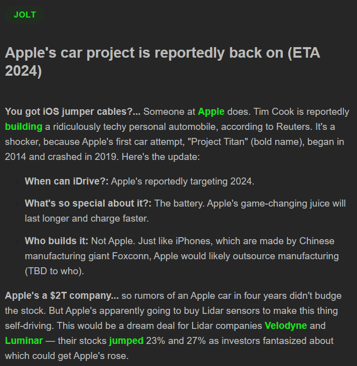 테슬라랑 애플 두 종목 모두 보유하고 있는 사람으로선 전기차를 두고 경쟁하는 양쪽 기업에 골고루 투자한 셈이 되어서 나쁘지 않은듯