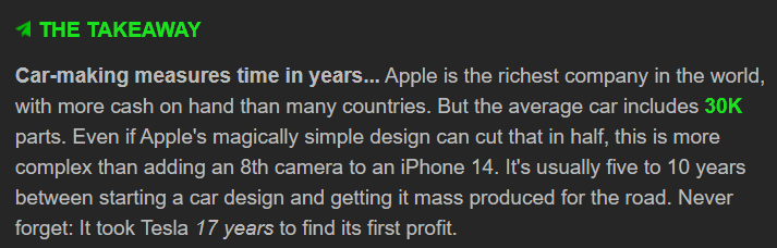 애플이 아무리 심플한 디자인을 내놓는다고 해도 자동차를 만드는 건 아이폰 만드는 것 보다 훨씬 복잡하다는 의견도. 보통 디자인을 시작해서 대량 생산까지 5~10년이 걸린다고 한다.