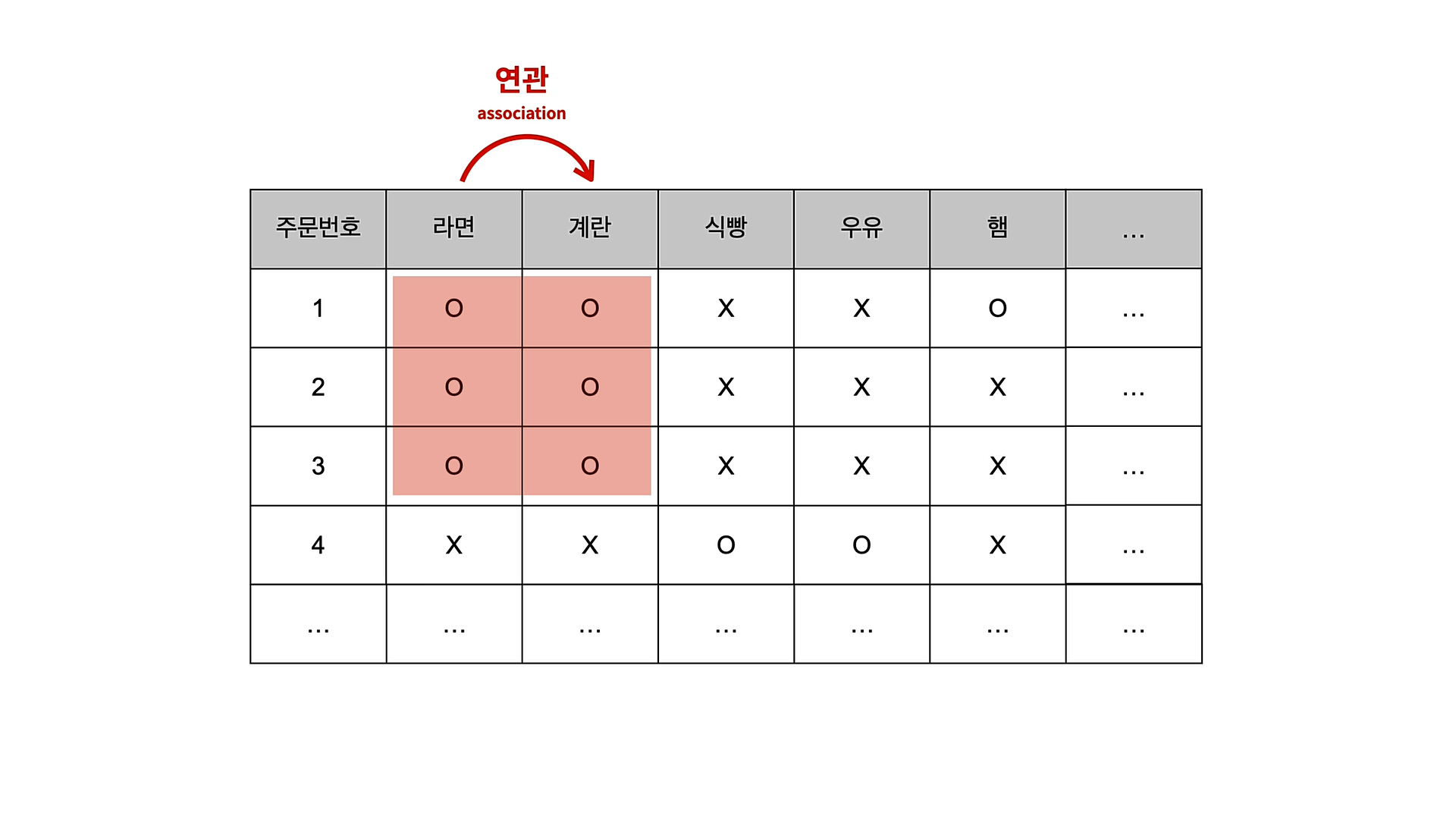 예를 들어, 위 경우엔 라면을 구매하는 소비자는 계란도 살 가능성이 높다는 상관관계를 파악하고 추천에 이용할 수 있음.
