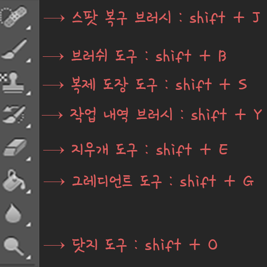공식 사이트를 보며 정리한 건데 흐림 도구는 단축키가 없네요?