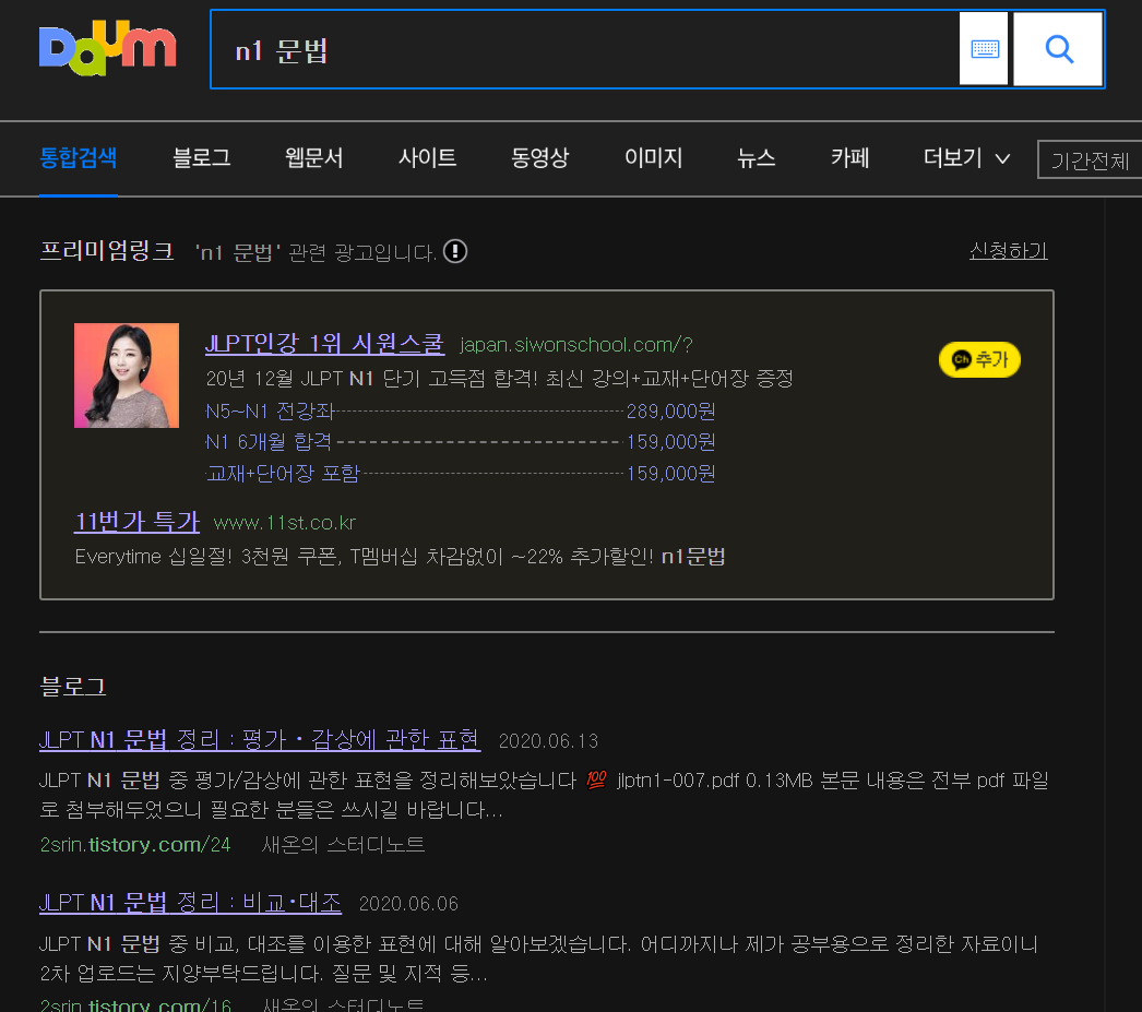 다음에서 n1문법으로 검색하면 상단에 내 블로그 글이 두 개나 뜬다!