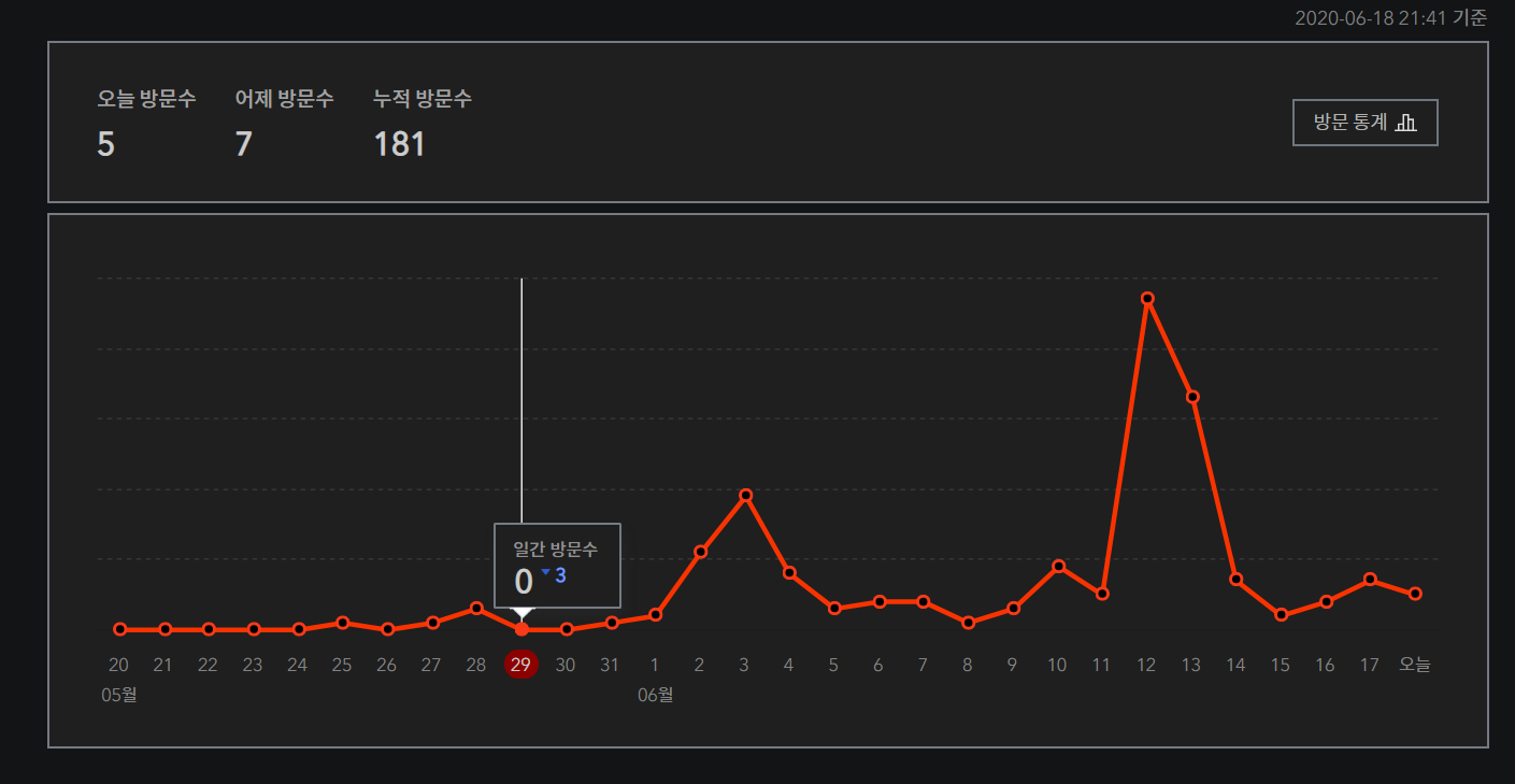 그 결과 나온게 윗글인데, 보다시피 6월 3일 자 방문자수가 20명대로 약간 뛰어오르긴 했지만