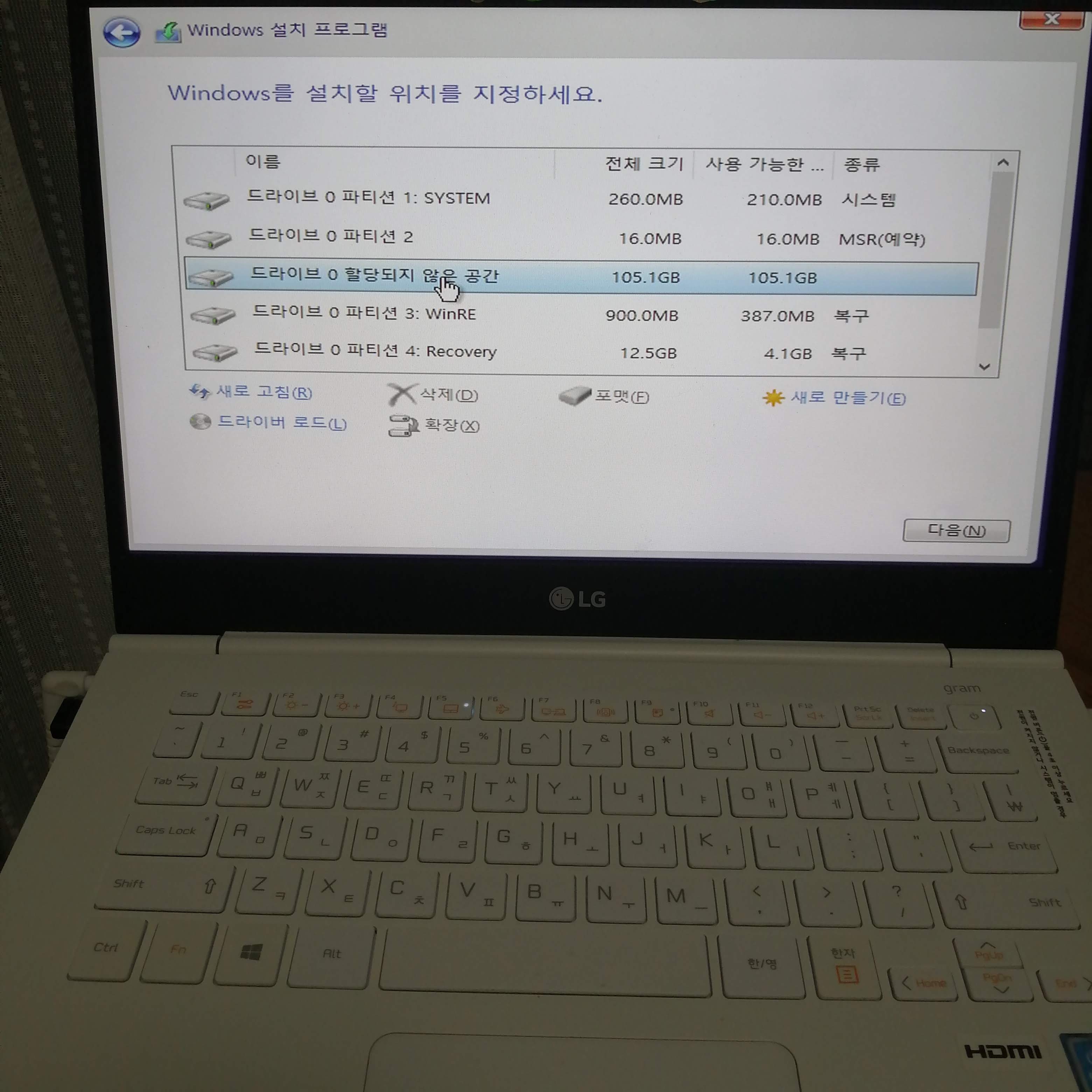 저기에 '새로 만들기(E)'로 다시 파티션을 생성후 다음으로 넘어갑니다.