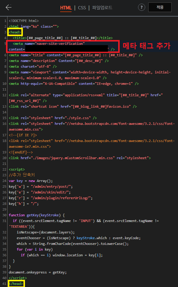 이제 저 태그를 티스토리 블로그에 붙여넣기 해야합니다.