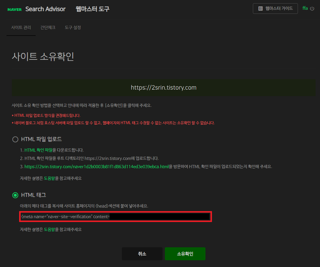 아직 소유확인 버튼은 누르지 말고 그대로 네이버 창을 켜둔 상태에서,