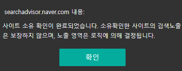 위와 같이 사이트 소유 확인이 완료되었다는 팝업 창이 뜹니다.