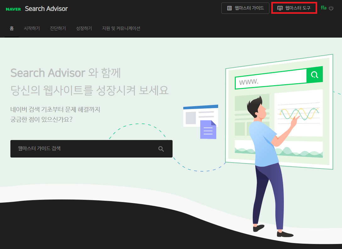 오른쪽 상단의 <웹마스터 도구>를 클릭합니다