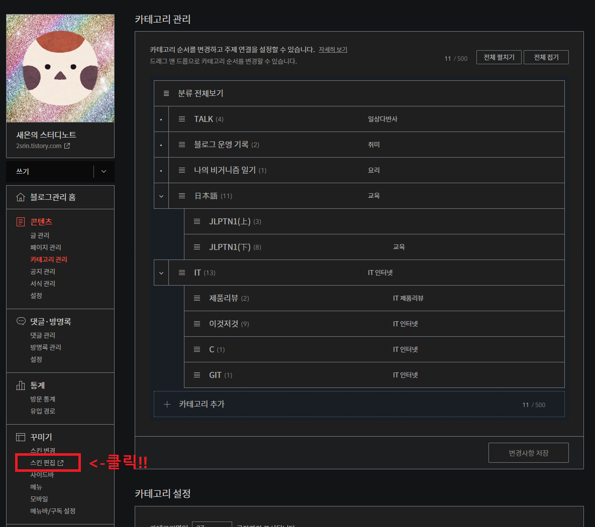 티스토리 블로그 관리 페이지에 들어갑니다.