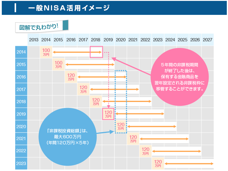 먼저 일반 NISA의 경우인데요, 비과세 기간이 5년이란 게 대략 위와 같은 이미지랍니다.