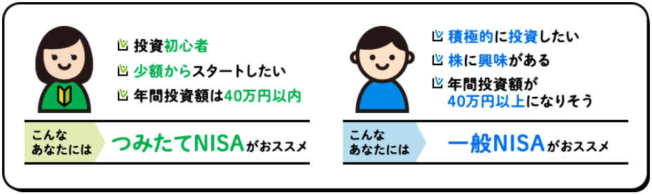 연간 투자액이 40만엔 이내인 투자 초심자는 츠미타테 니사를, 연간투자액이 40만엔 이상이 될 것 같은 투자자는 일반 니사를 만드는 게 좋습니다.