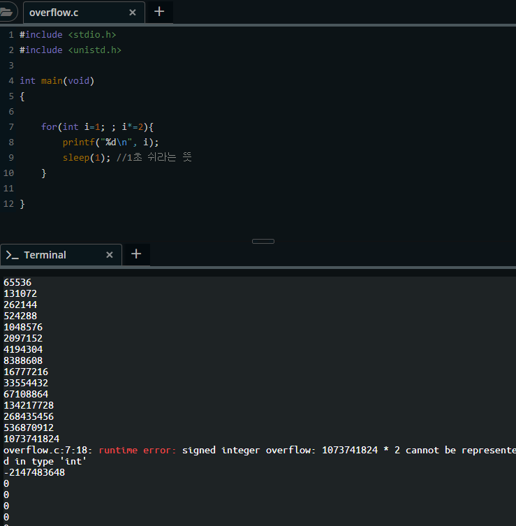 위 프로그램은 i에 2를 계속 곱하면서 출력하는 것인데, int형이 표현할 수 있는 숫자의 범위를 넘어서서 오류가 발생했다. 이를 오버플로우라고 한다.