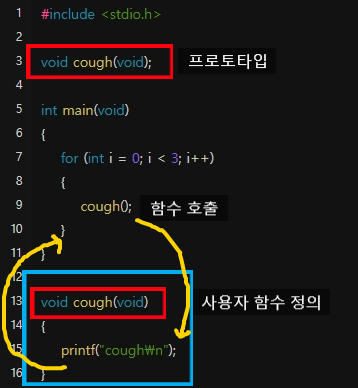 만약에 사용자 정의 함수를 메인 함수보다 위에 적는다면 굳이 프로토타입을 적을 필요가 없지만 가독성이 떨어지기 때문에 보통은 말머리에 프로토타입을 적고 함수 본체는 메인 함수 뒤에 적는다.