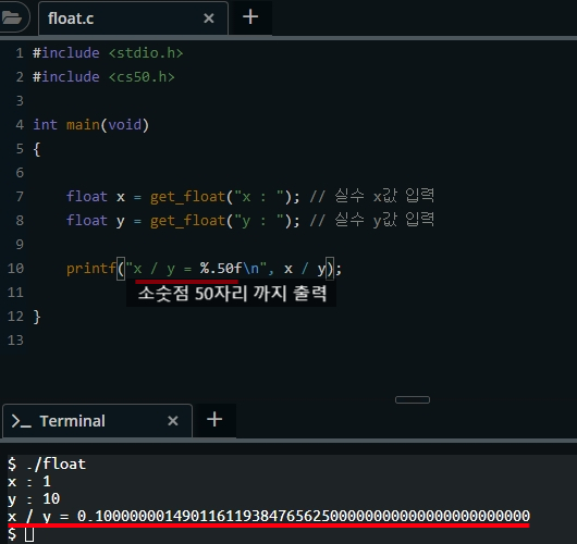 1과 10으로 나누었는데 결괏값이 조금 이상하다. 이는 float 자료형이 32비트까지만 숫자를 담기 때문에 그 뒤는 연산이 안 되는 부분이 생기고, 결과적으로 0.1에 가장 가까운 값을 저장하기 때문이다.