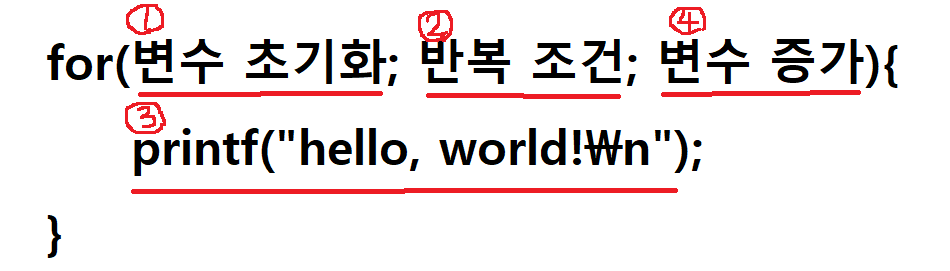 for문의 실행 순서는 1234234234..라고 생각하면 된다. 변수 초기화는 처음만 해주고 그다음부턴 조건을 판단하고 괄호 안의 코드를 실행하고 변수를 증가시키고를 반복한다.