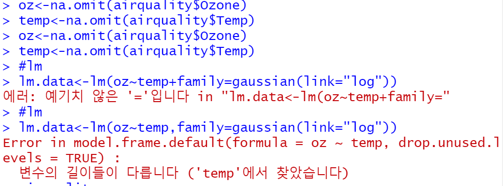 lm()을 적용하니 변수의 길이들이 다르다고 에러가 뜬다.