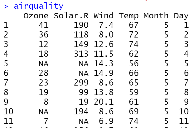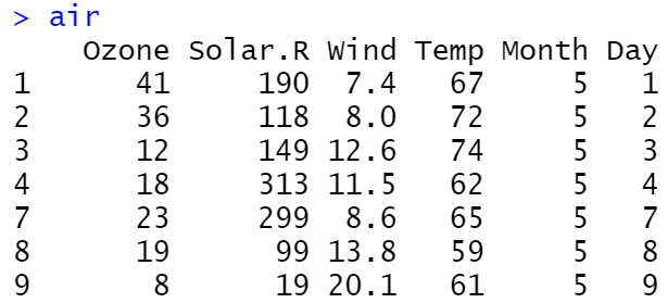 NA값을 제거한 airquality를 직접 보면 기존에 NA값이 포함된 행은 모두 삭제된 것을 알 수 있다.