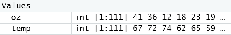 보다시피 oz와 temp의 데이터 개수가 일치한다. 위에서는 111개보다 자료 값이 많았지만 서로 개수가 일치하지 않아 선형 회귀를 하려고 하니 에러가 떴었다.