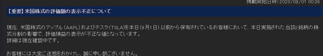 자고 일어나니까 보유 종목 모두 양전했는데 수익이 제대로 표시가 안되네요. 라쿠텐에서 온 알림 확인해보니 애플이랑 테슬라가 주가 분할 영향으로 평가손익이 제대로 표시되지 않는 모양입니다. (+글 쓰는 동안 다시 확인해보니 수정됐네요!)