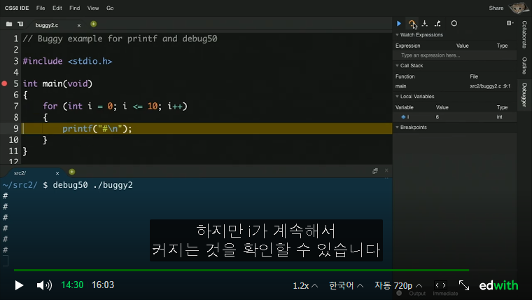 * CS50 IDE에서는 명령어 debug50으로 디버깅 가능. ex) debug50 ./buggy2