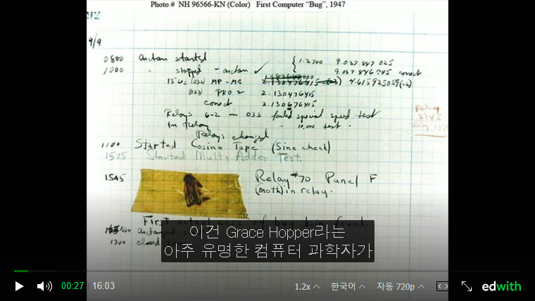 - 버그(bug) : 코드의 오류를 의미함. 그레이스 호퍼라는 컴퓨터 과학자가 컴퓨터 내에서 벌레(=버그,bug)를 찾은 것에서 유래함.