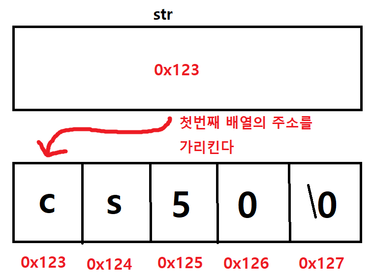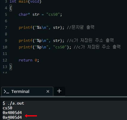 주의할 점은 "cs50"이라는 문자열 자체도 문자열이 시작하는 주소를 가리킨다는 것이다. 이는 배열의 이름이 배열이 시작하는 주소를 가리키는 것과 같은 원리이다. 그래서 %p 변환자로 출력하면 위와 같이 주솟값이 나온다. str은 문자열의 주솟값을 담고있으니 당연히 주솟값을 출력한다.
