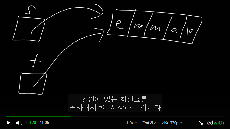 만약 위와 같이 s에 문자열을 입력받고, s를 바로 t에 대입한다면 문자열이 복사되는 것이 아니라 문자열의 주소를 전달해주는 꼴이 된다. s는 문자열의 주소를 저장하기 때문이다.