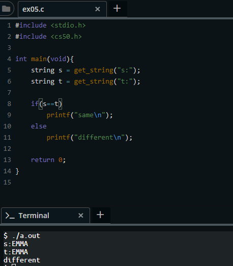 이는 우리가 입력한 문자열이 메모리의 각기 다른 영역에 저장되기 때문이다. 따라서 문자열의 시작 주소를 가리키는 s과 t를 비교하면 둘은 다르다고 판단한다.