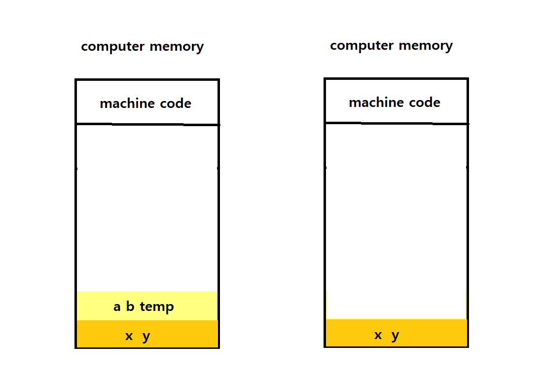 스택의 제일 아래 영역에는 변수 x,y가 그 위에는 a,b,temp 가 존재한다.