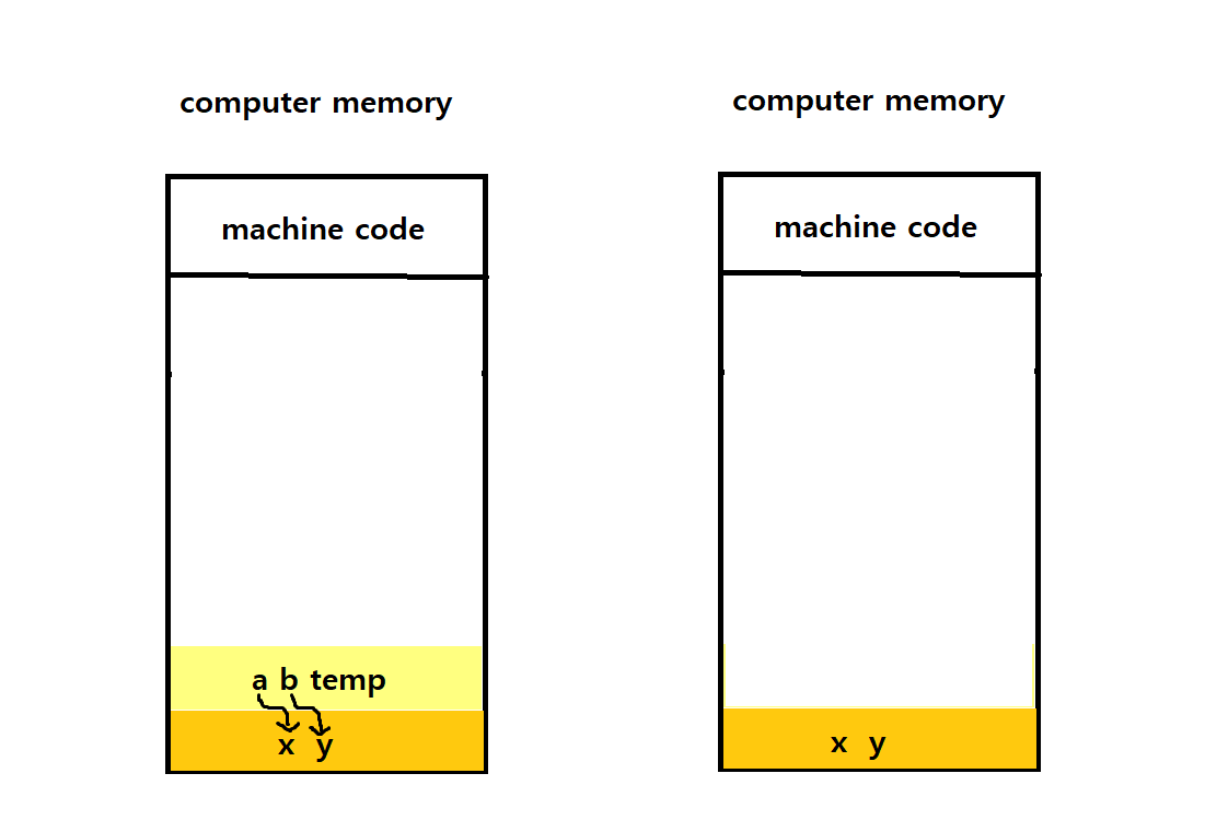 하지만 포인터를 사용하면 변수 a와 b가 직접 x와 y를 가리키게 하여 값을 수정하는 게 가능하다.