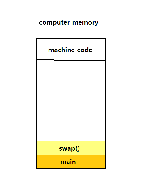 스택의 제일 아래에 메인함수의 지역변수들이 존재하고 메인함수가 swap함수를 호출하면 윗 공간을 swap함수에할당한다.