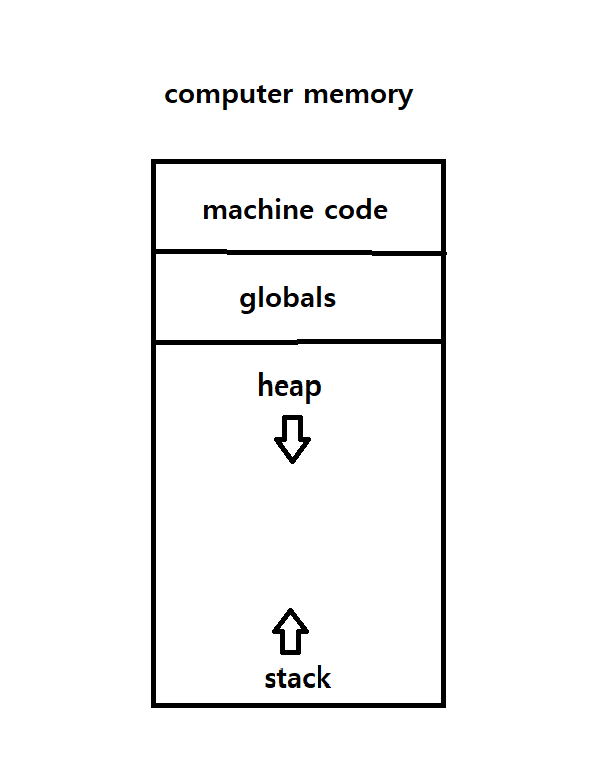 위의 프로그램이 메모리에서 차지하는 공간은 대강 이런 이미지이다.