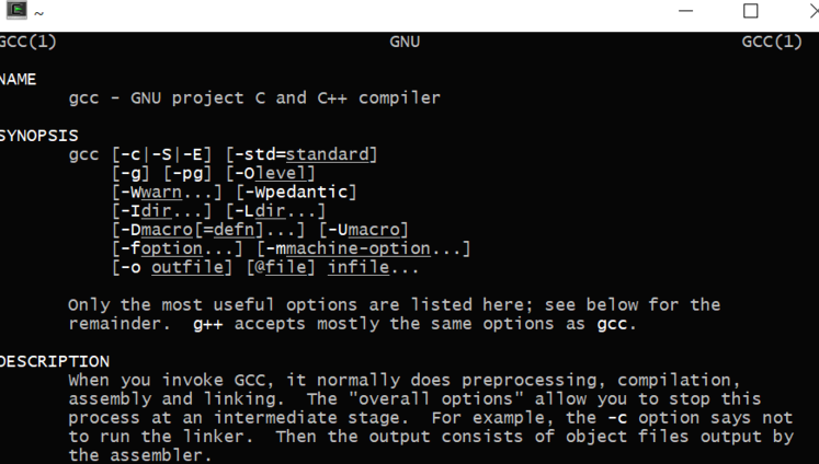 커맨드 창에 man gcc를 입력하여 gcc가 정상적으로 설치되어