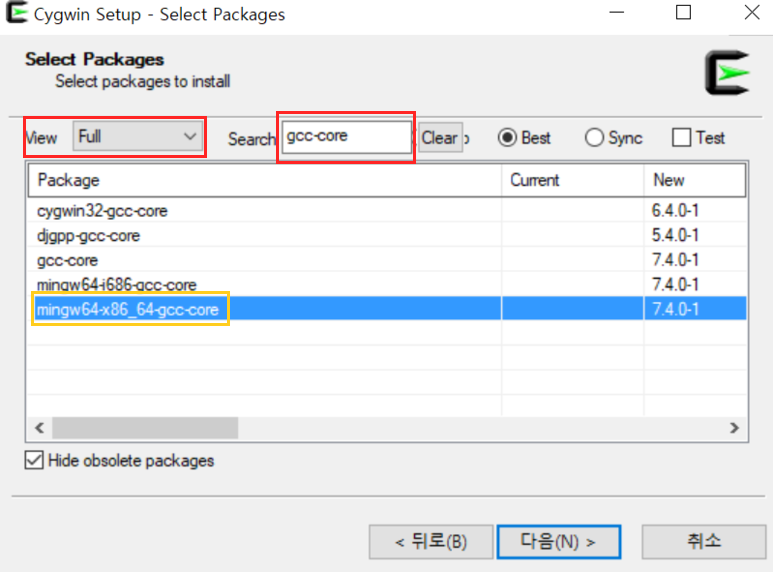 mingw64-x86_64-gcc-core를 찾습니다.