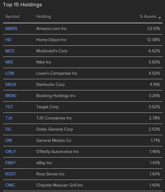 ETF에 포함된 종목들을 보고 고른다고 하면 ONLN빼고 FDIS, XLY, VCR은 다 비슷비슷합니다. 개인적으로 XLY같은건 전통적인 투자 스타일이고 ONLN은 비교적 최근에 떠오른 기업에 투자를 하고 있다는 이미지네요. 나름의 매력이 있는 것 같습니다.