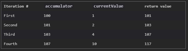 1. accumulator = 100, currentValue = 배열의 첫번째 값