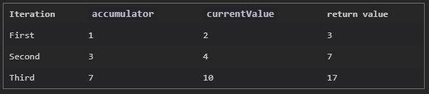 1. accumulator = 배열의 첫번째 값, currentValue = 배열의 두번째 값